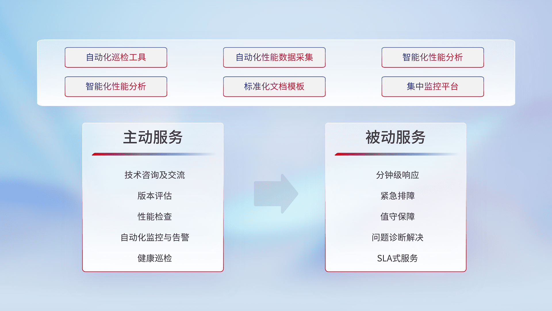 智能化工具和标准化文档,,,保障服务质量,,提供主动服务(包含技术咨询、、版本评估、、、、性能检查、、自动化监控与告警、、健康巡检)和被动服务包含(分钟级响应、、、紧急排障、、、值守保障、、、问题诊断解决、、、、SLA服务)。。。。